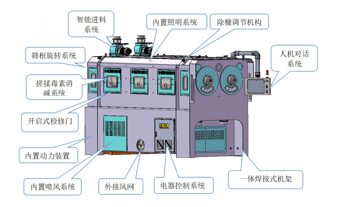 2、差速逆向金剛石搓板搓揉結(jié)構(gòu):物料經(jīng)機(jī)械推動(dòng),高密度揉搓室及負(fù)壓的作用下,使附著在物料表面的真菌毒素分離并排出機(jī)外。